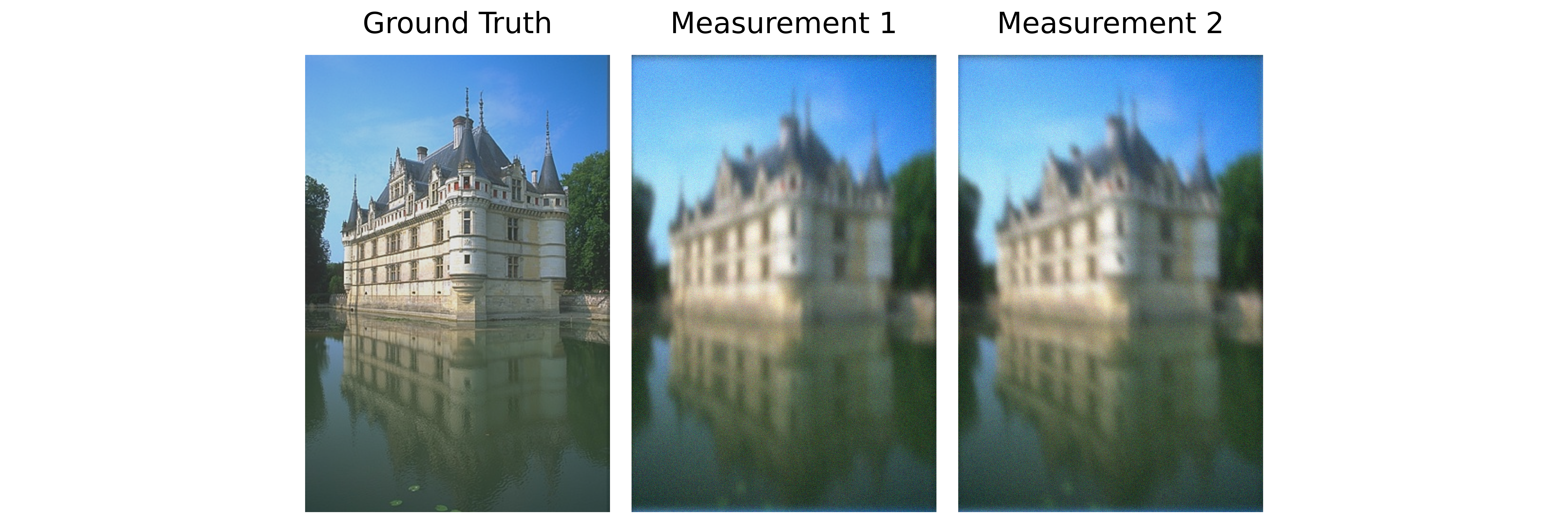 Left to right: Ground truth (original sharp image), Measurement 1 (blur angle 0°), Measurement 2 (blur angle 25.7°)